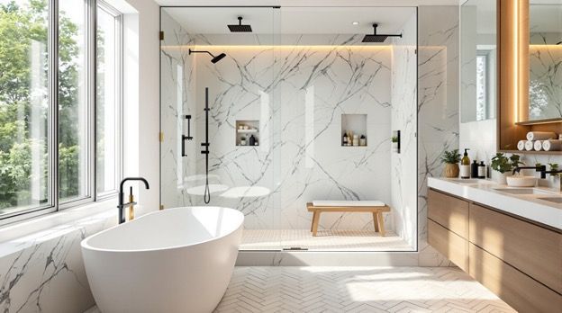 Large-format tile and solid surfaces also reduce grout lines, which makes cleaning easier and keeps the bathroom looking fresh longer.