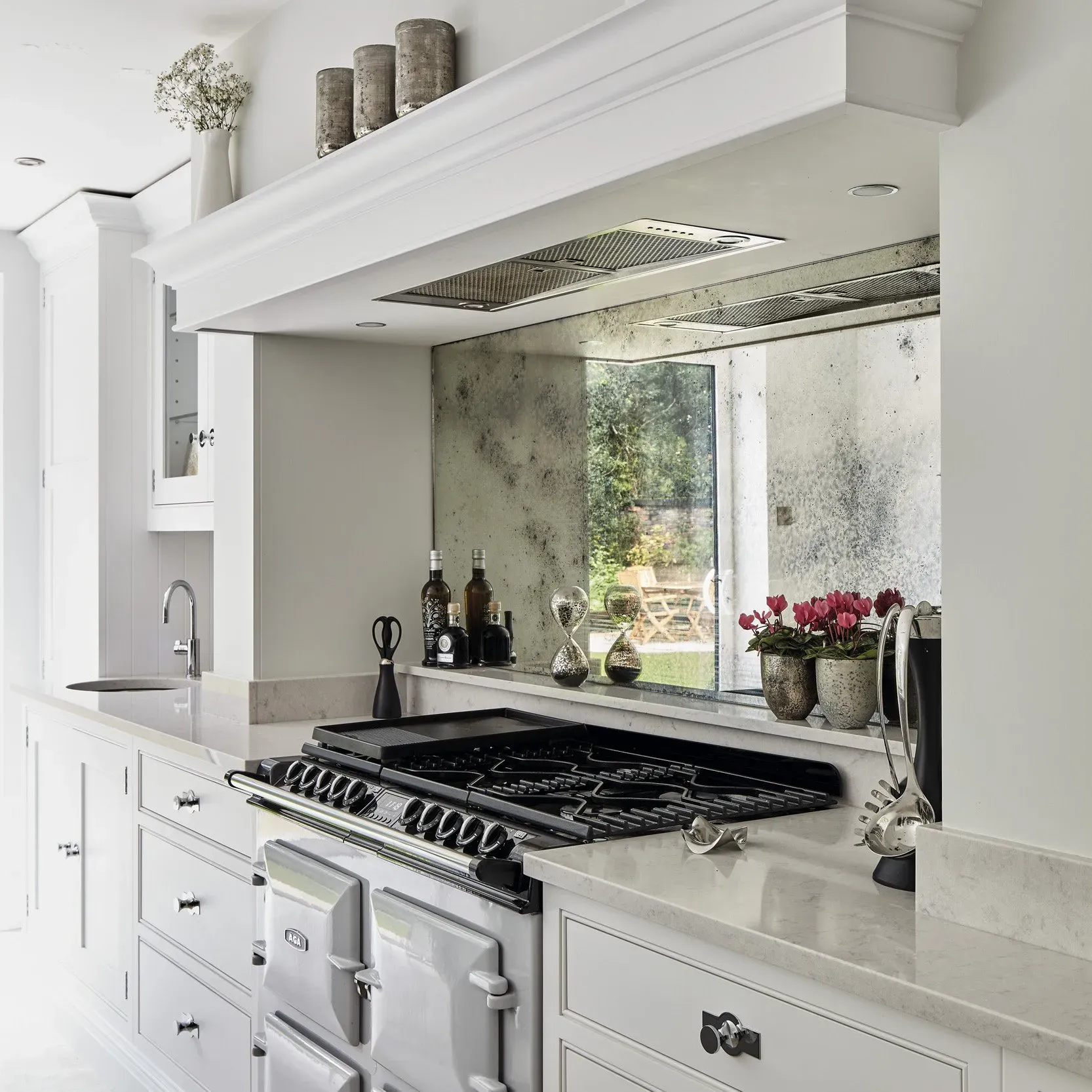 Mirrors help to make smaller rooms larger, and the kitchen is no exception. We will often recommend a mirrored backsplash or stainless steel if stainless steel is the preferred appliance finish. Mirrored surfaces provide a sense of depth to any room, making the space look and feel larger.