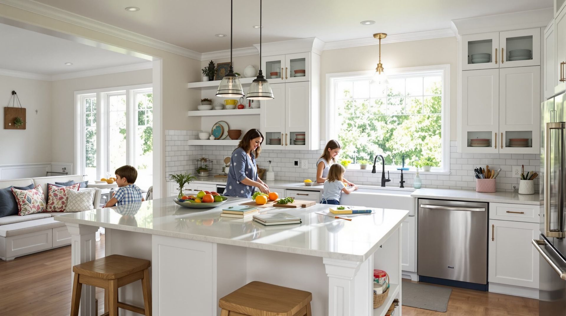 A practical layout makes everyday tasks easier. Open or semi-open spaces help parents cook while staying connected with kids or guests. Adding an island provides extra workspace and doubles as a place for snacks or homework.