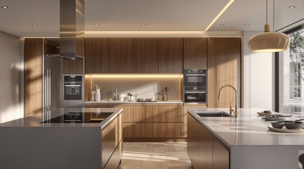 Layered lighting, including under-cabinet strips, pendants over islands, and dimmable controls, creates both visibility and atmosphere. Planning these elements early avoids costly electrical changes once cabinets are installed.